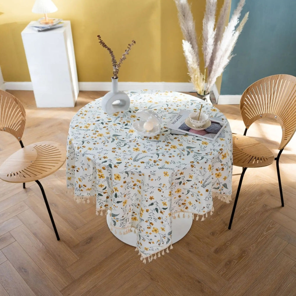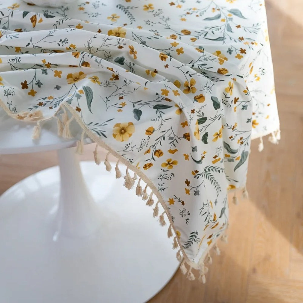 Set the scene with this floral tassel tablecloth, designed to bring a fresh and inviting glow to your dining space. Featuring golden blooms and soft tassel edging, it’s the perfect blend of charm and durability—ideal for family meals, lunch parties, or everyday styling.